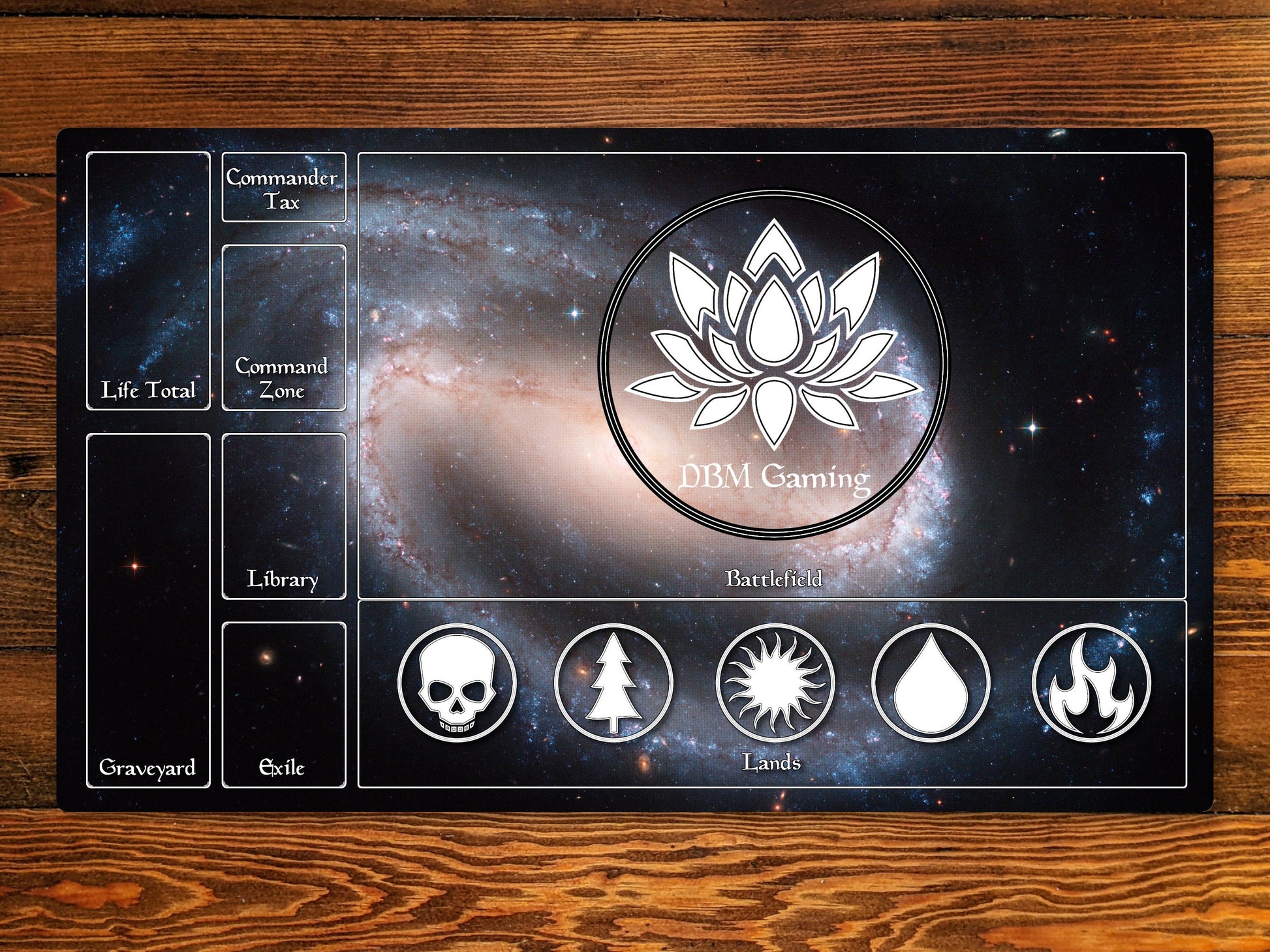 Level up your gaming table with this playmat showcasing DBM's custom Zone Board Layout with a photo of the Barred Spiral Galaxy NGC 1300 for a background. Choose from Commander and Trainer Zone Layouts