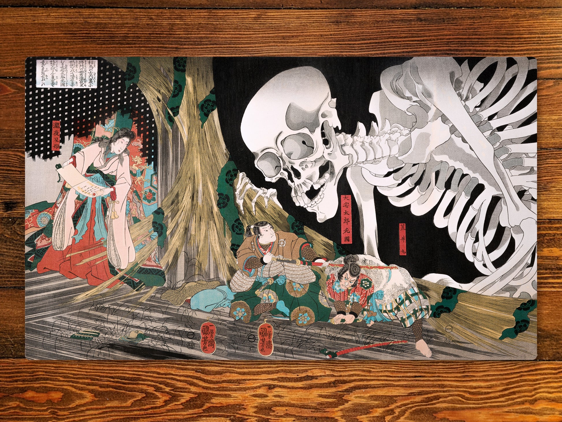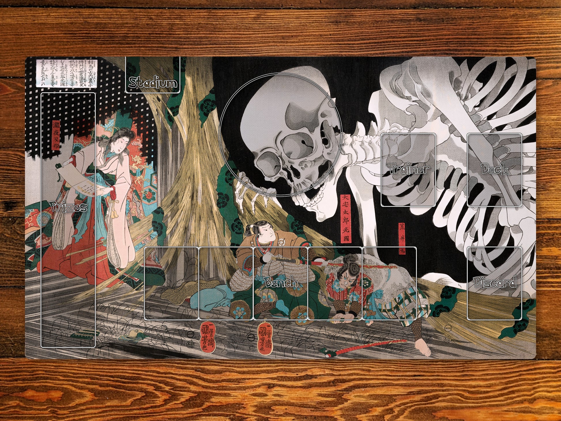 Level up your gaming table with this playmat showcasing highly detailed and vibrant artwork of Japanese artist Utagawa Kuniyoshi and his painting "Mitsukuni Defying the Skeleton Specter (1910)"