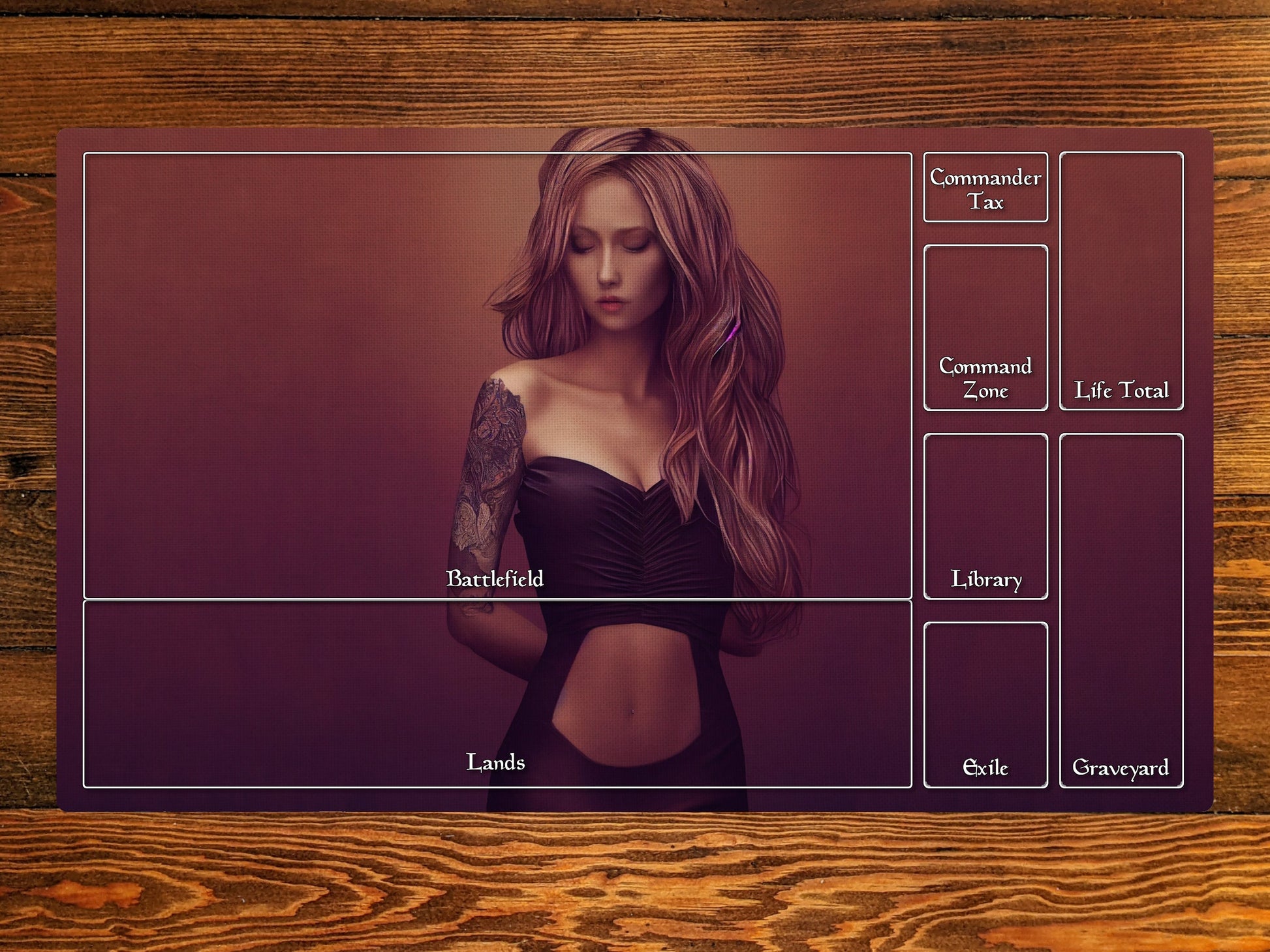 This playmat can help you stay organized and play your best during your next commander game. On it, you will have space for your land, the battlefield, command zone, commander tax, cards in exile, your graveyard, and a spot to place your life counter.