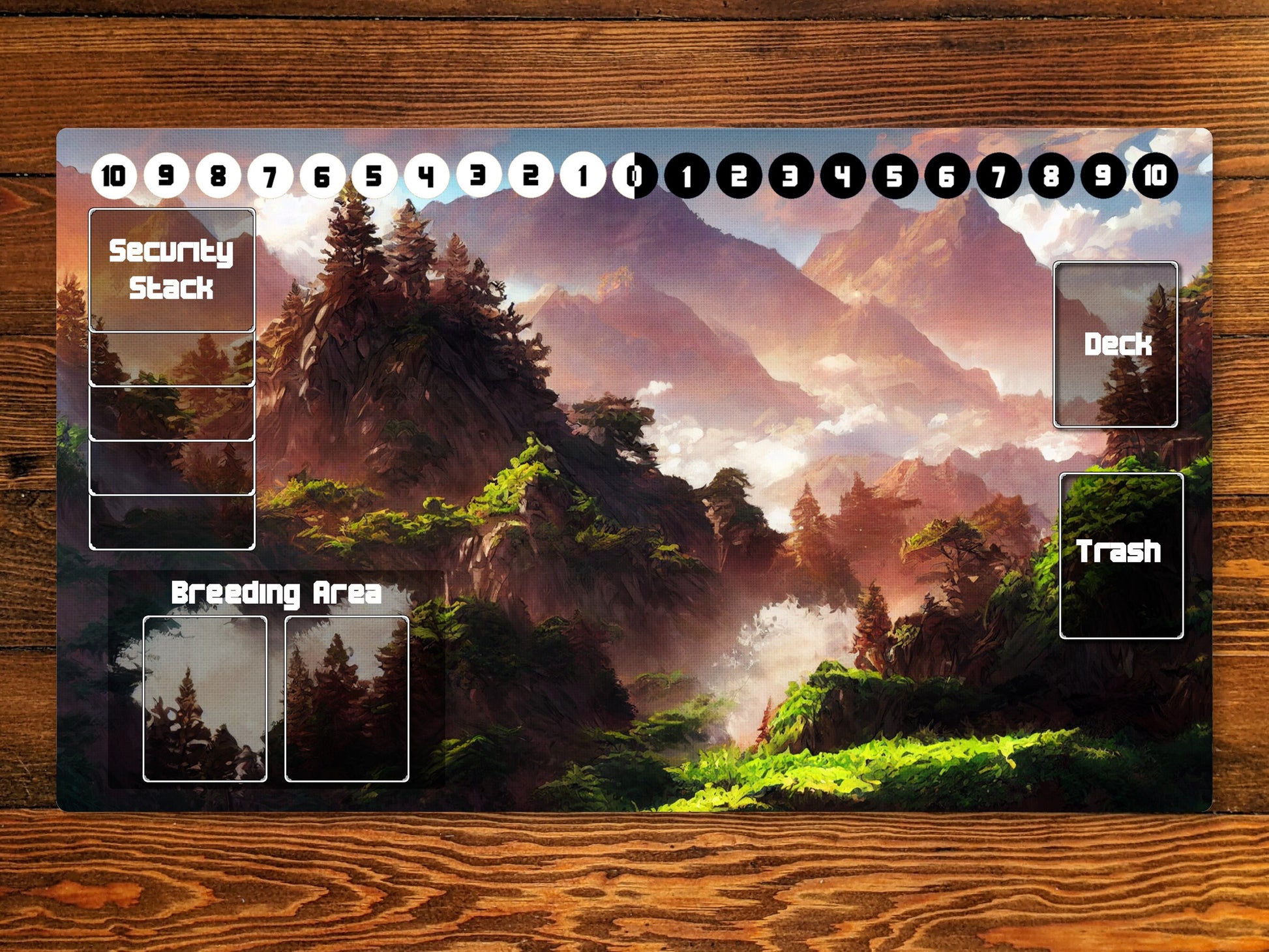 Level up your gaming table with this Taiga landscape playmat showcasing a DBM original design for the player in your group that plays aggro, stomp, burn, or any other green or red playstyles.