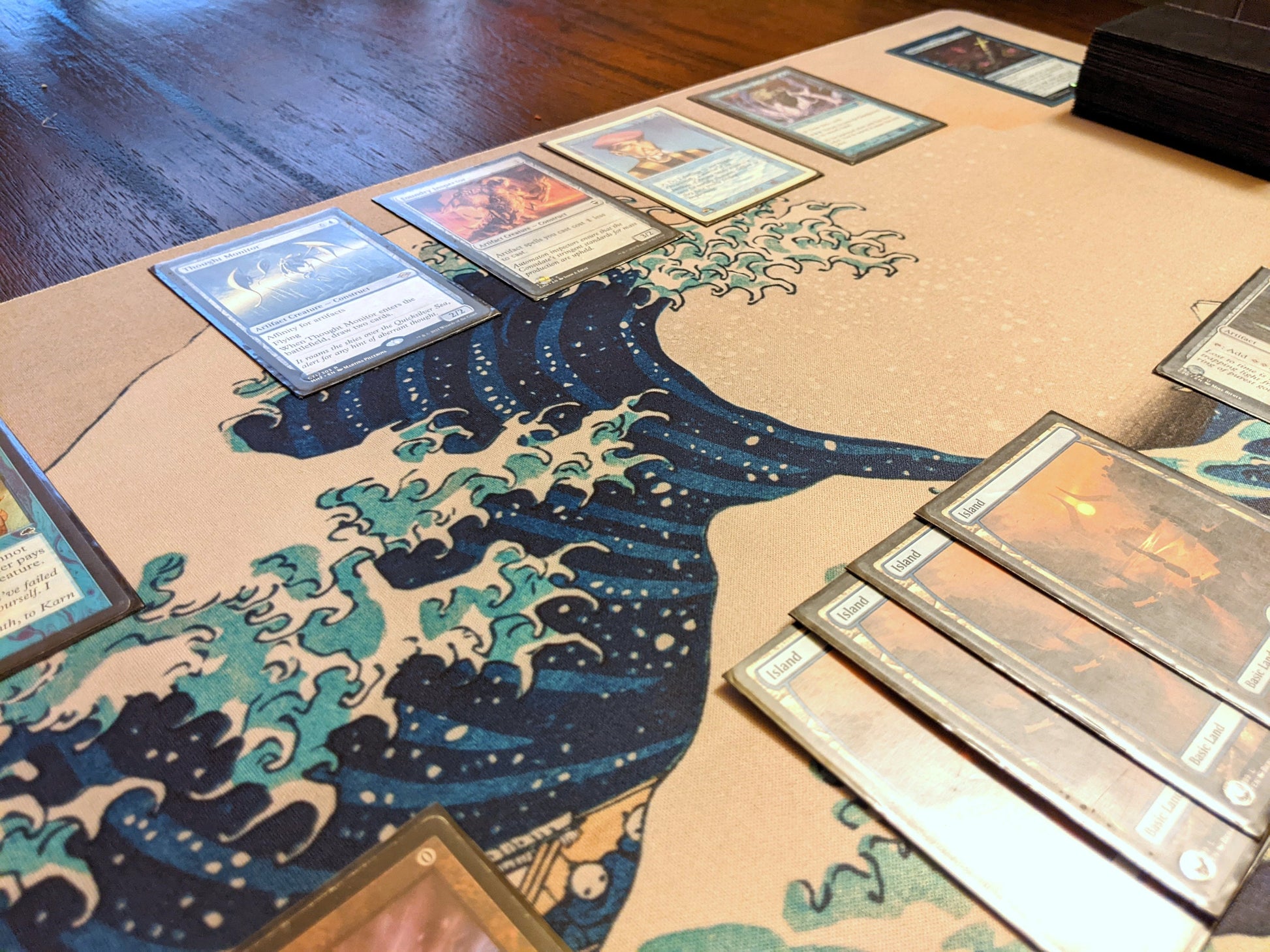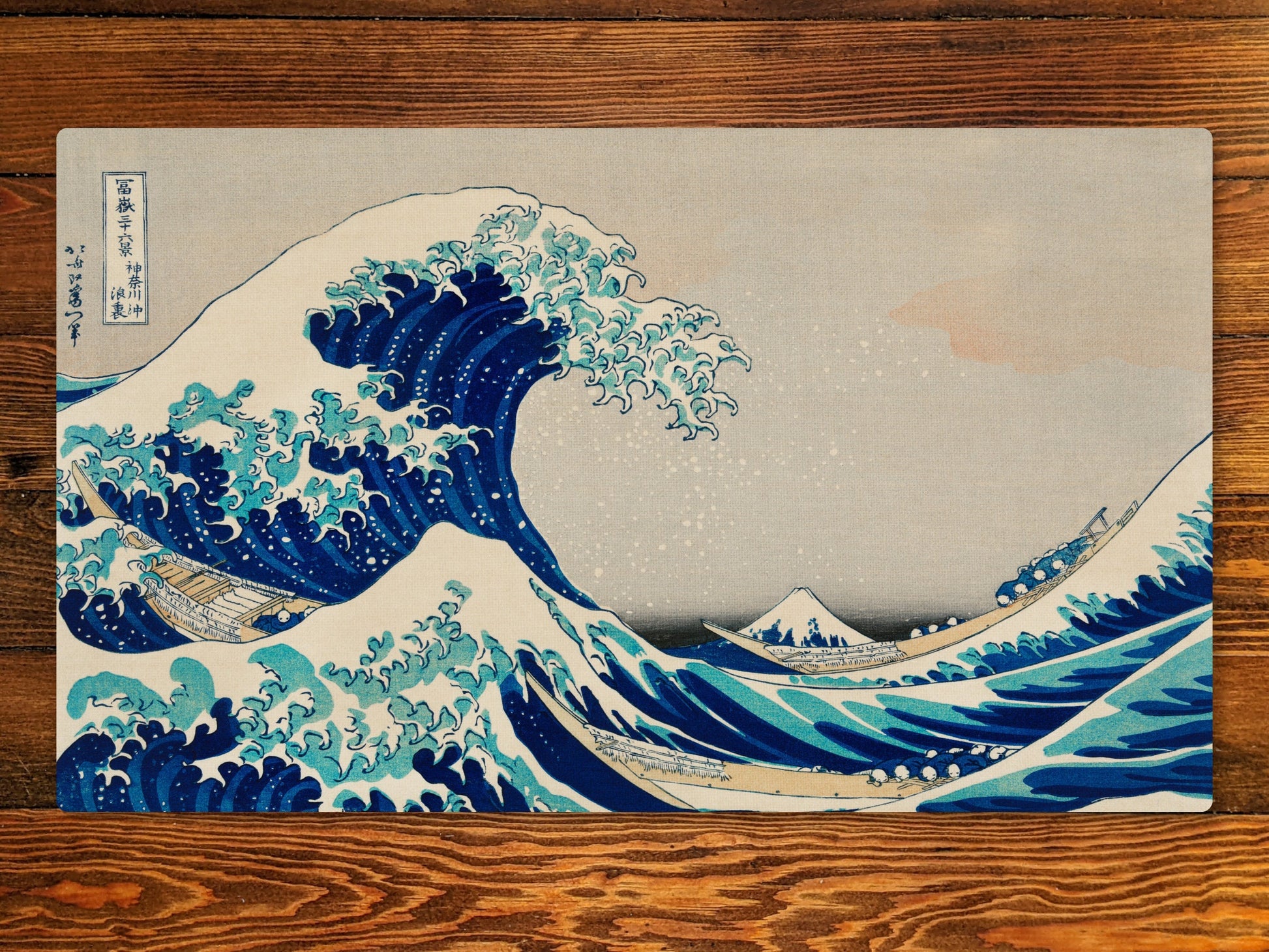 Level up your gaming table with this playmat showcasing highly detailed and vibrant artwork of Japanese artist Katsushika Hokusai and his painting "Under the Wave off Kanagawa."