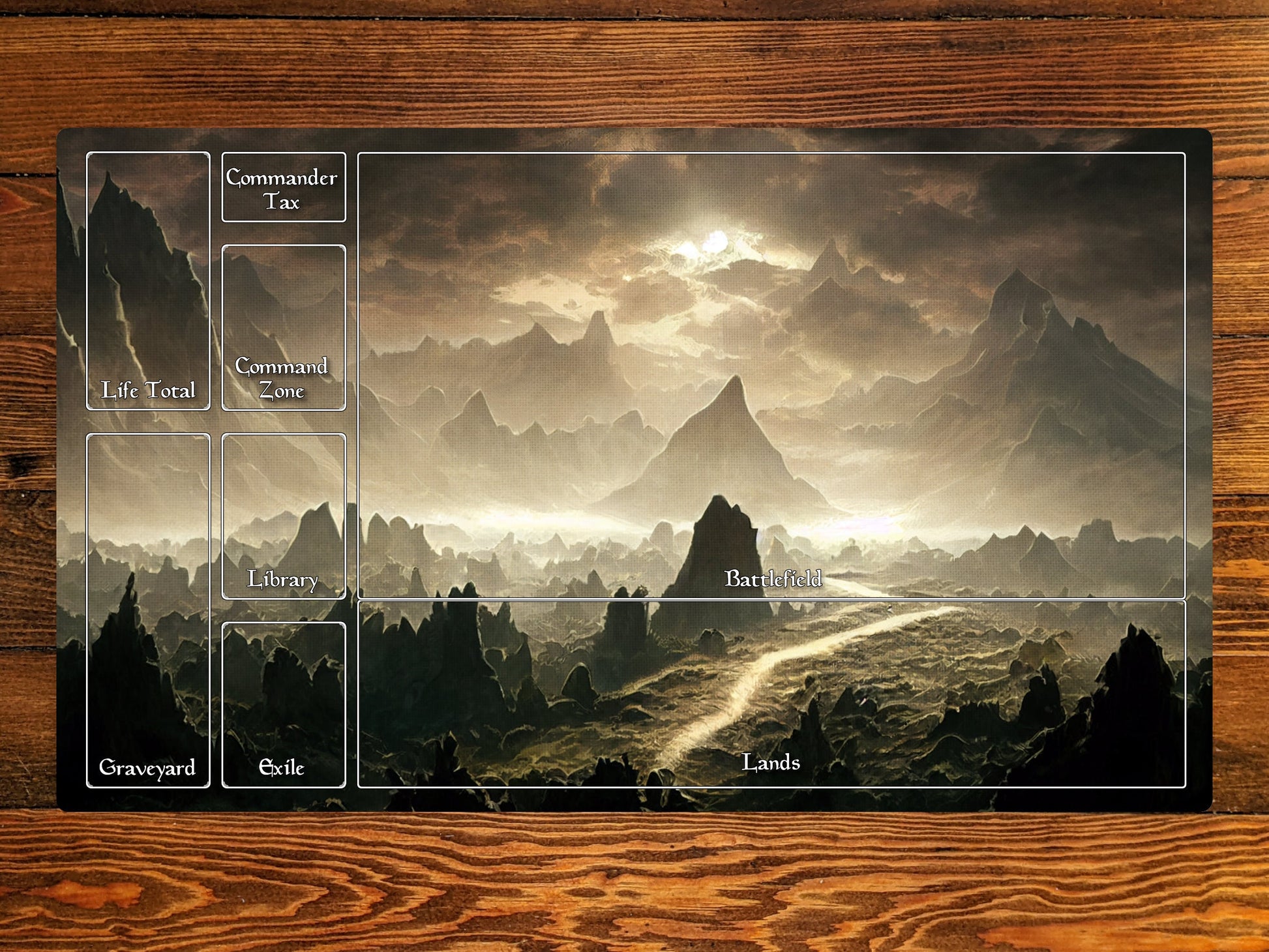 This playmat can help you stay organized and play your best during your next commander game. On it, you will have space for your land, the battlefield, command zone, commander tax, cards in exile, your graveyard, and a spot to place your life counter.